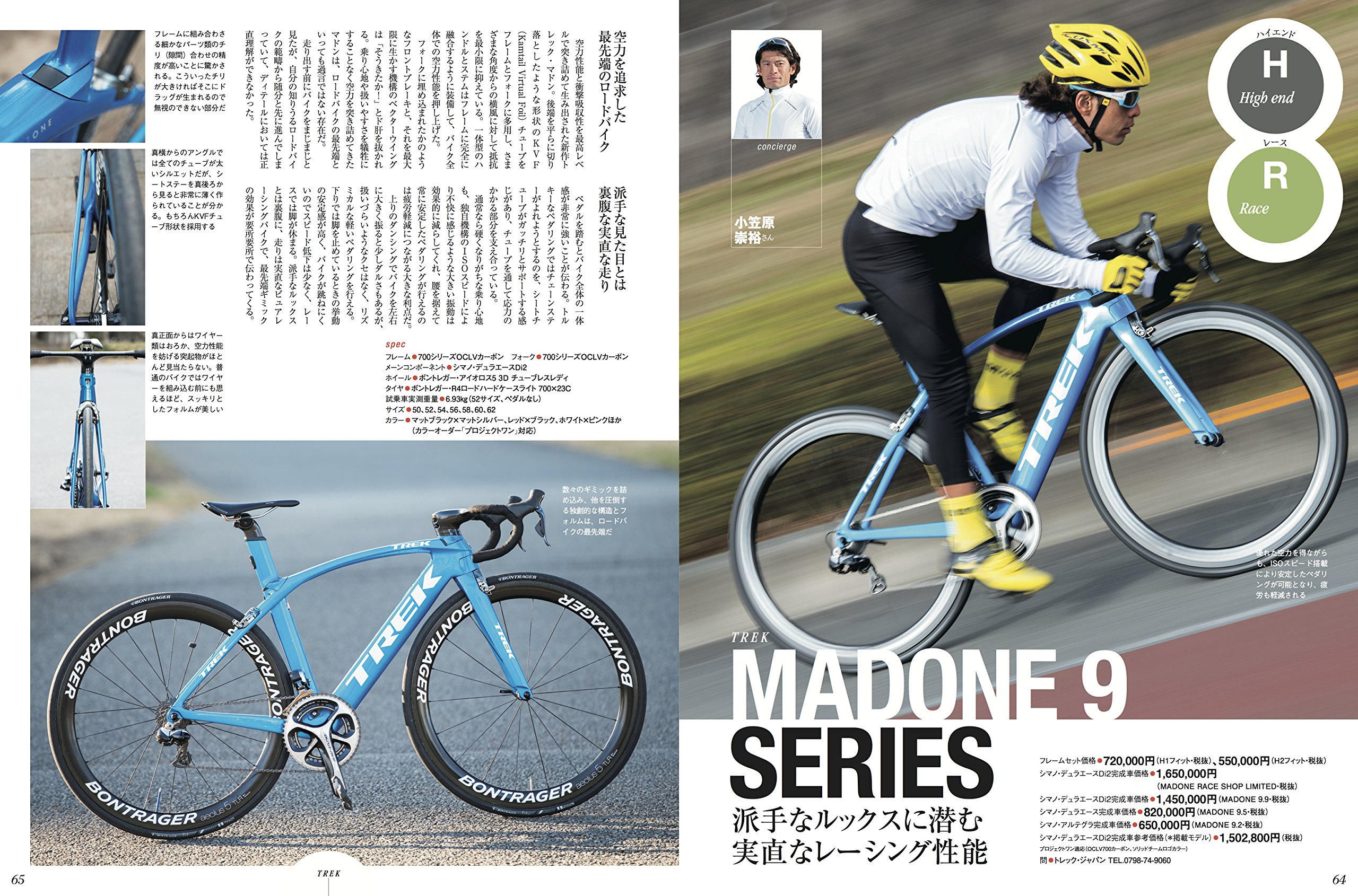 1ページ目が、達人の迫力のあるライド写真。2ページ目は、屋外で撮影された横からの自転車写真と、特徴を絞った詳細紹介文というページ構成。スペック情報もあるが値段とフレーム、コンポの種類、タイヤなど割とさっくりしていて、パーツ何gなどすごい細かい情報はない。これらの情報を削る勇気を賞賛したい。初心者にとってはスペック情報が一台ずつあってもあまり参考にできない。バイクの特徴をビシッと教えてもらえる方がより自転車を理解しやすい。